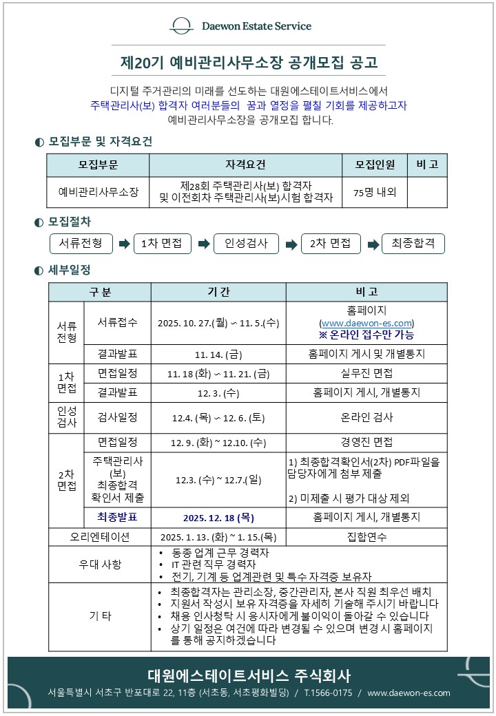 [ä¿ë¼·ù ¹Ýȯ°ü·Ã °íÁö] º» °íÁö´Â¡ºÃ¤¿ëÀýÂ÷ÀǰøÁ¤È¿¡°üÇѹý·ü¡»Á¦11Á¶6Ç׿¡ µû¸¥ °Í ÀÔ´Ï´Ù. ´ç»ç ä¿ë¿¡ ÀÀ½ÃÇÑ ±¸Á÷ÀÚ Áß ÃÖÁ¾ÇÕ°ÝÀÌ µÇÁö ¸øÇÑ ±¸Á÷Àڴ ä¿ëÀýÂ÷¹ý¿¡ µû¶ó Á¦ÃâÇÑ Ã¤¿ë¼·ùÀÇ ¹ÝȯÀ» û±¸ ÇÒ ¼ö ÀÖ½À´Ï´Ù. 1.ä¿ë¼·ù ¹Ýȯ½Åû±â°£: ÀüÇüº° ÇÕ°ÝÁö ¹ßÇ¥ÀÏ ÀÌÈÄ 14ÀÏ À̳»(ä¿ëÀýÂ÷¹ýÁ¦11Á¶) 2.ä¿ë¼·ù ¹Ýȯ½Åû:¡¸Ã¤¿ë¼·ù ¹Ýȯû±¸¼¡¹(ä¿ëÀýÂ÷¹ý ½ÃÇà±ÔÄ¢ º°Áö3) ÀÛ¼ºÁ¦Ãâ(ȨÆäÀÌÁö ¶Ç´Â À̸ÞÀÏ) 3.ä¿ë¼·ù ¹Ýȯ¹æ¹ý: º»ÀÎÁ÷Á¢ ¼ö·É ¶Ç´Â µî±â¿ìÆí(¼ö½ÅÀںδã) 4.ä¿ë¼·ù º¸°ü±â°£: 180ÀÏ(ÇØ´ç±â°£ ³» ¹Ýȯû±¸ ¾øÀ» °æ¿ì °³ÀÎÁ¤º¸º¸È£¹ý¿¡ µû¶ó ÆÄ±â) 5.ä¿ë¼·ù ¹ÝȯÀÇ ¿¹¿Ü: ȨÆäÀÌÁö ¶Ç´Â ÀüÀÚ¿ìÆíÀ¸·Î Á¦ÃâµÈ °æ¿ì ¶Ç´Â ȸ»ç°¡ ¿ä±¸ÇÏÁö ¾Ê°í Áö¿øÀÚ°¡ ÀÚ¹ßÀûÀ¸·Î Á¦ÃâÇÑ °æ¿ì